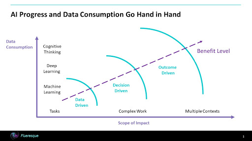 While ML requires significant amounts of data to self-modify its behavior, the appetite of AI increases quickly as the sophistication of the AI capabilities increase. There is a big step from machine learning to Deep Learning (DL) in that DL requires much more data than ML. The reason being that DL is usually only able to identify concept differences with the layers of neural networks. DL determines the edges of concepts when exposed to millions of data points. DL allows machines to represent concepts via neural networks as the human brain does, thus allowing more complex problem-solving. AI can also work on fuzzier problems where the answers are more uncertain or ambiguous. These are typically judgment or recognition problems that can extend to the creation or other right-brained activities. This again requires more data, which in some cases may be emergent or real-time in nature.