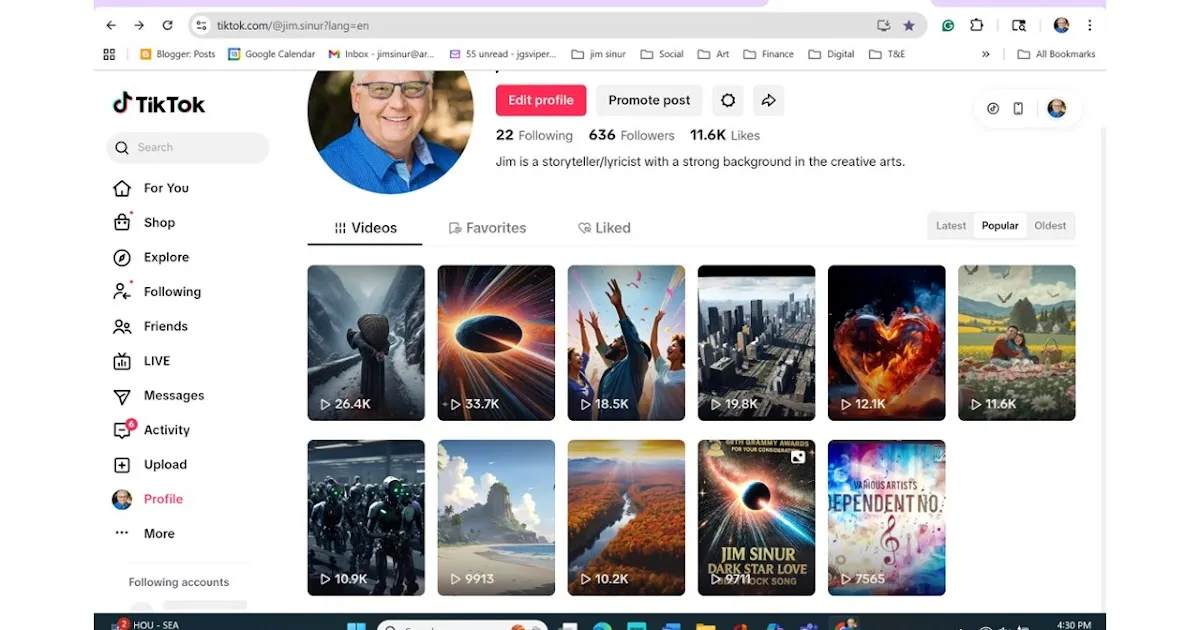 My co-producer and genius partner, Ethan Foxx was using AI videos to promote his songs. So Ethan taught me how to create AI videos synchronized with the songs we both produced. I went on my own after a couple of collaborative videos Ethan and I created. I learned how to script for Kaiber AI and create my own AI music videos. It's been a blast waiting overnight for AI to render a video, and now I see the results. It usually takes me two or three times before I get a Video I like. I figured the best way to expand my audience was to post the videos on YouTube and TikTok, targeting a younger demographic. Well, the results have been pretty impressive, as you can see above in the image from TikTok. Over 11K likes and over 200K views. You can find me on TikTok, or click here for YouTube access. The most popular videos are "Forgive" and "Dark Star Love". The best video is "Cry for Creation"
