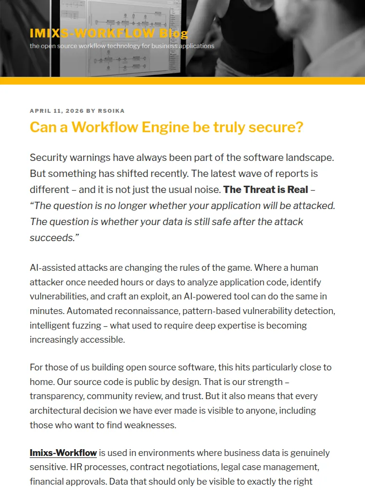 Imixs-Workflow is used in environments where business data is genuinely sensitive. HR processes, contract negotiations, legal case management, financial approvals. Data that should only be visible to exactly the right people at exactly the right time. We have always built our security model with this in mind.