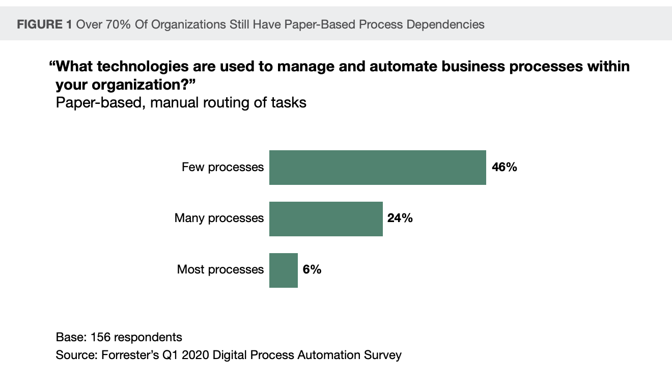 According to Forrester’s Q1 2020 Digital Process Automation Survey, over 70% of organizations have paper-based process dependencies. In other words, many companies are still struggling to deal with hundreds to thousands of data entries and paper processes manually each day. This has resulted in decreased productivity, higher expenses spent on buying papers and printers, time wasted to search for a document and eventually miscommunication might occur.