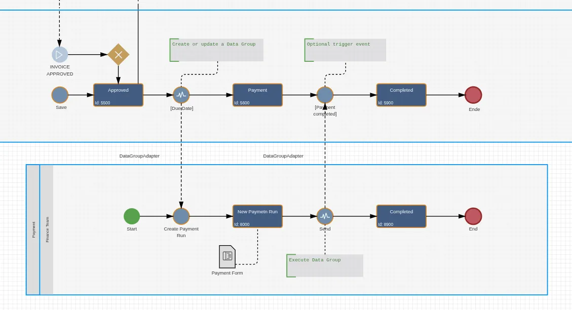 The following diagram shows an example from an invoice workflow. After an invoice was approved and the due date is reached, the invoice is added to a data group of the workflow ‘Payment’. The invoice holds now the relationship to the payment run.
