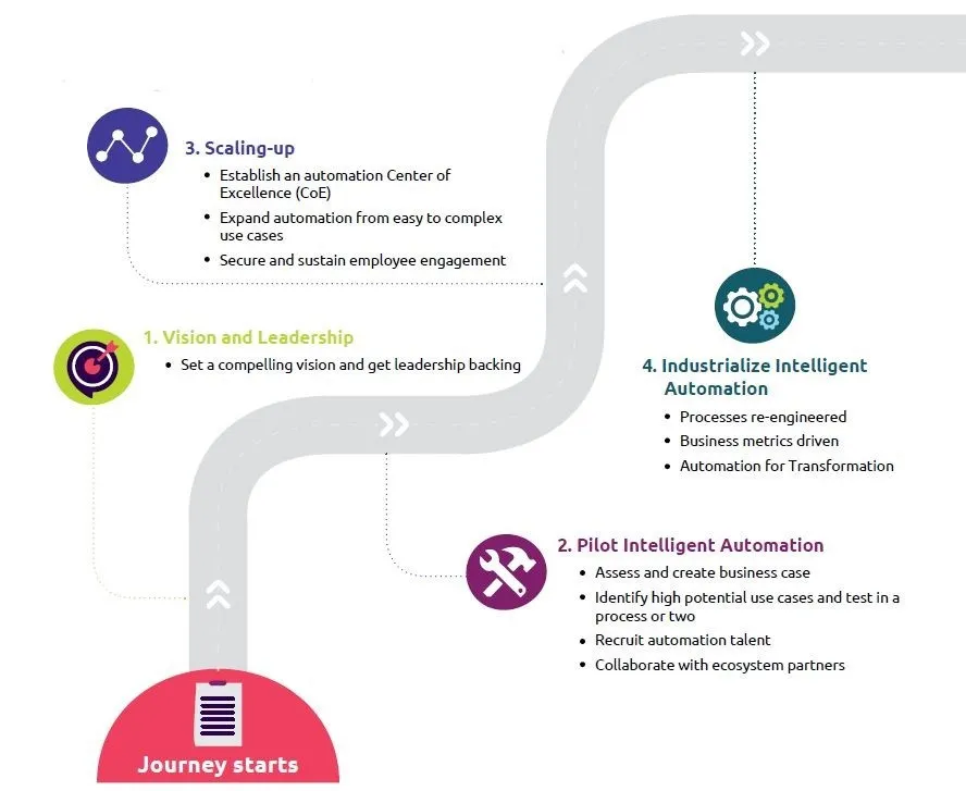 Four distinct phases can be used to map a firm’s automation journey: creating a vision and garnering leadership support, piloting intelligent automation, scaling up, and industrializing intelligent automation.