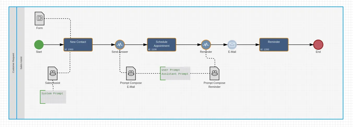 The new AI Assistant Adapter brings true process awareness to AI. It automatically understands the current state of your workflow and adjusts its behavior accordingly—all configured directly in your BPMN model.