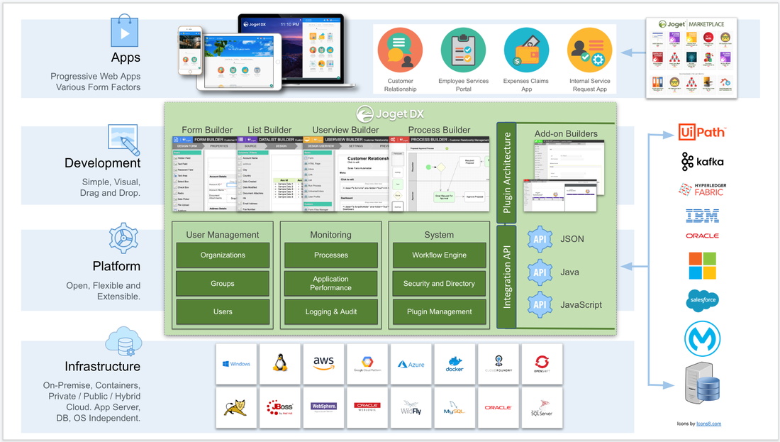 | Architecture of the Joget DX low-code platform Why Joget DX Low-Code Platform? With low-code platforms like Joget DX, business developers can supercharge their application delivery and improve the adaptability of app development using drag-and-drop and features like built-in support for Progressive Web Apps, Application Performance Monitoring and Artificial Intelligence. As the amount of time has been reduced dramatically from writing lines of codes to dragging and dropping elements, business developers with zero programming knowledge can easily turn their app ideas into reality, while reducing the time-to-market from months to weeks or even days. As the only open source low-code platform featured in the Forrester Now Tech report, Joget offers a unique combination of simplicity, flexibility and openness to suit any enterprise. With its agile environment, business and professional developers can collaborate to develop and deliver full-fledged enterprise applications to fulfill a wide variety of application use cases and cater to different business requirements. Click here to watch the tutorial on how to build a Visitor Management App on Joget DX in less than 20 minutes. Get Started: Start building your own enterprise app with Joget DX and choose your desired deployment options from on-premise to containers and cloud native platforms to suit your business requirements. Other resources to help you get started: