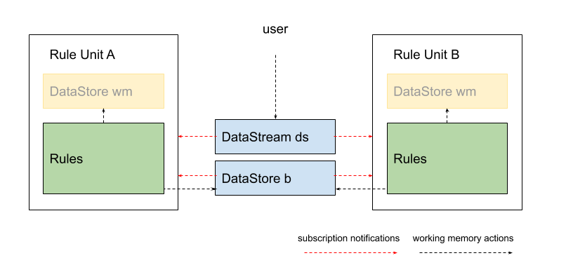 But rule units may be also put in a long-running state. In this case, other rule units may be run concurrently at the same time; because DataSources can be shared across units, units can be coordinated by exchanging messages.