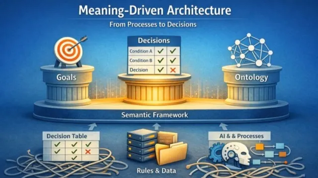 Meaning-driven architecture offers an alternative. By explicitly modelling goals, decisions and domain concepts, systems become transparent, testable and easier to govern. Instead of hiding logic in process flows or rule sets, decision tables make reasoning explicit—providing a stable semantic foundation for both traditional IT and AI. Link