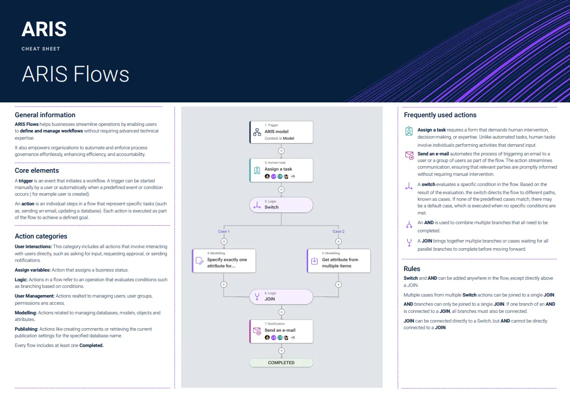 We launched our brand-new ARIS Flows cheat sheet β designed to help you get a first quick overview of ARIS Flows and start exploring its capabilities right away.