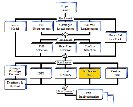 This path is a subset of the normal Delivery processes. It does not include design or development tasks as it is targeted at a system that is pre-defined and non-configurable. However, the same (or greater) care must be taken with environmental, human and organisational issues, as there is less likelihood that an organisation’s overall needs will be fully addressed by a fixed configuration solution.