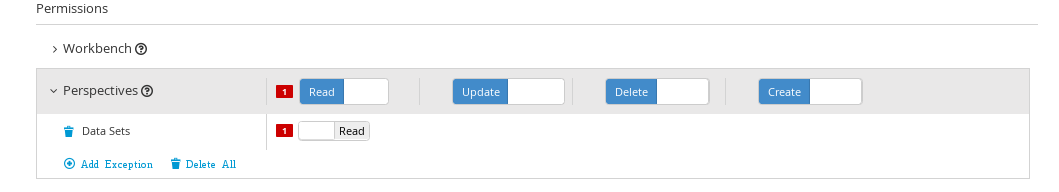 NOTE: In the example above, the Update and Delete permissions are disabled as it does not makes sense to define such permissions if the user is not even able to read perspectives.