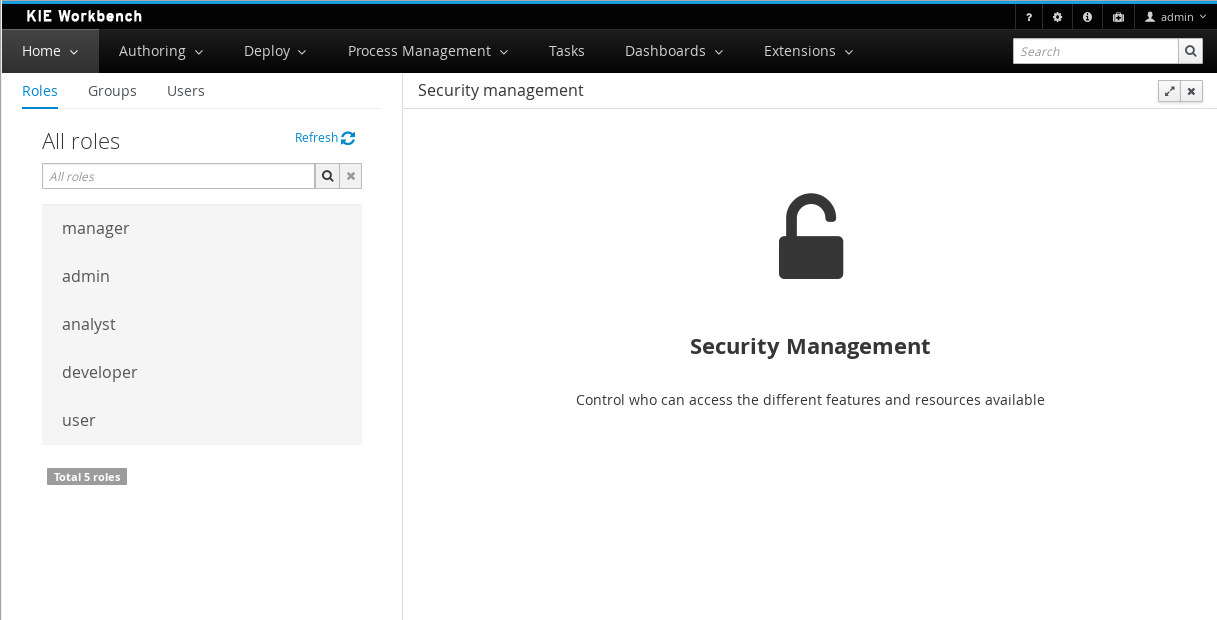 The jBPM 7 release will include an integrated security management solution to allow administrator users to manage the application’s users, groups and permissions using an intuitive and friendly user interface. Once released, users will be able to configure who can access the different resources and features available in the workbench.